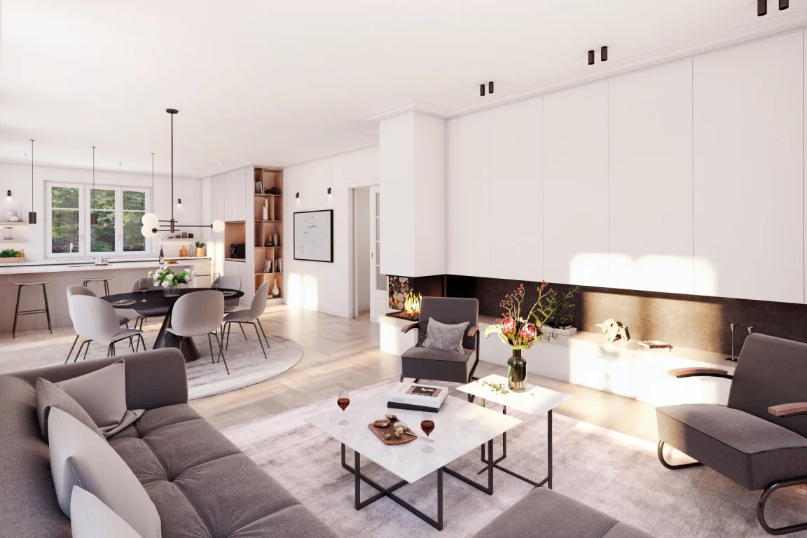 Die hochwertige Mehrfamilien-Villa bietet drei zum Teil mehretagige Eigentumswohnungen in Frohnau. Jede Wohnung besticht durch überdurchschnittliche Deckenhöhen, lichtdurchflutete Räume und weitläufige Raumfluchten mit durchdachten Blickachsen.
