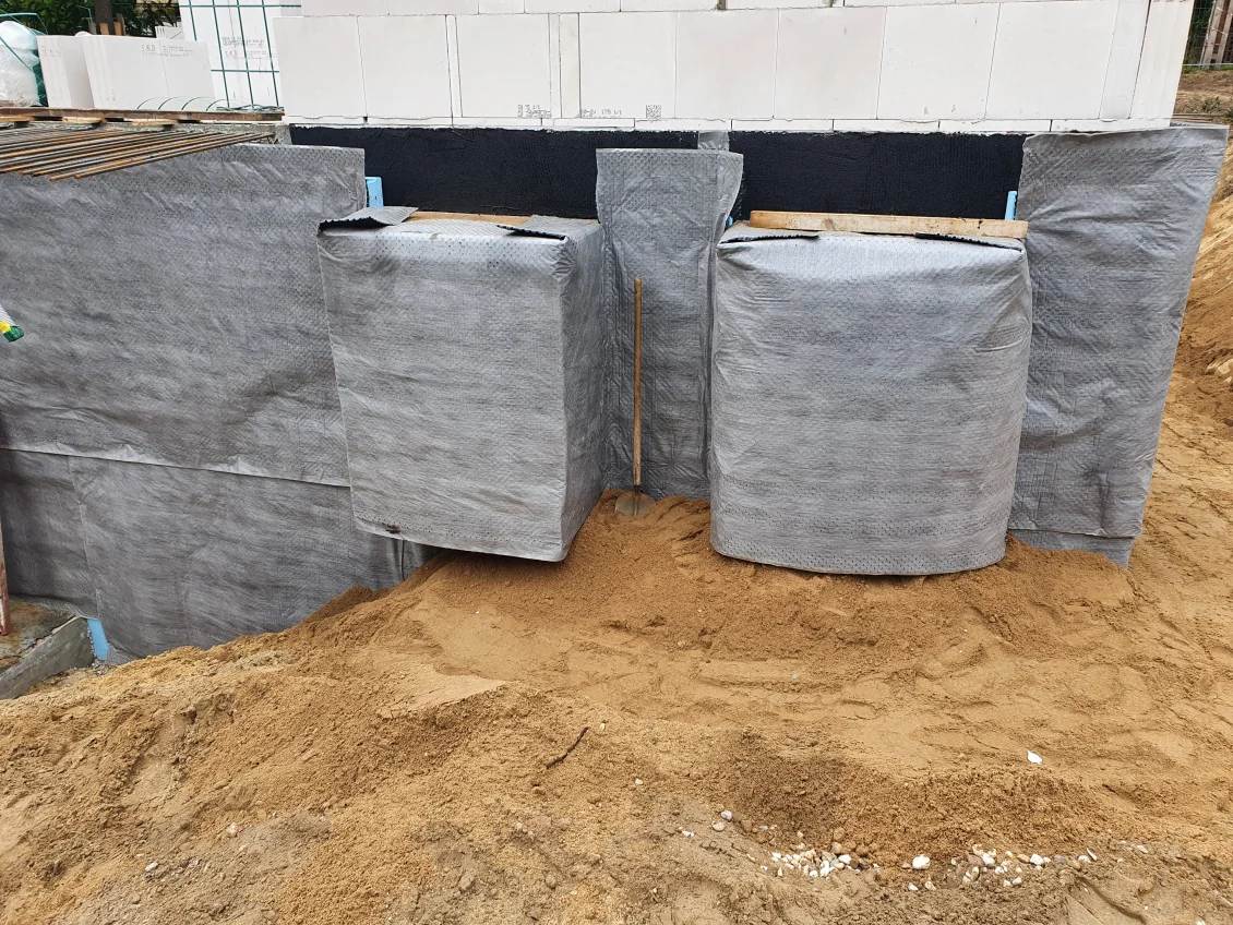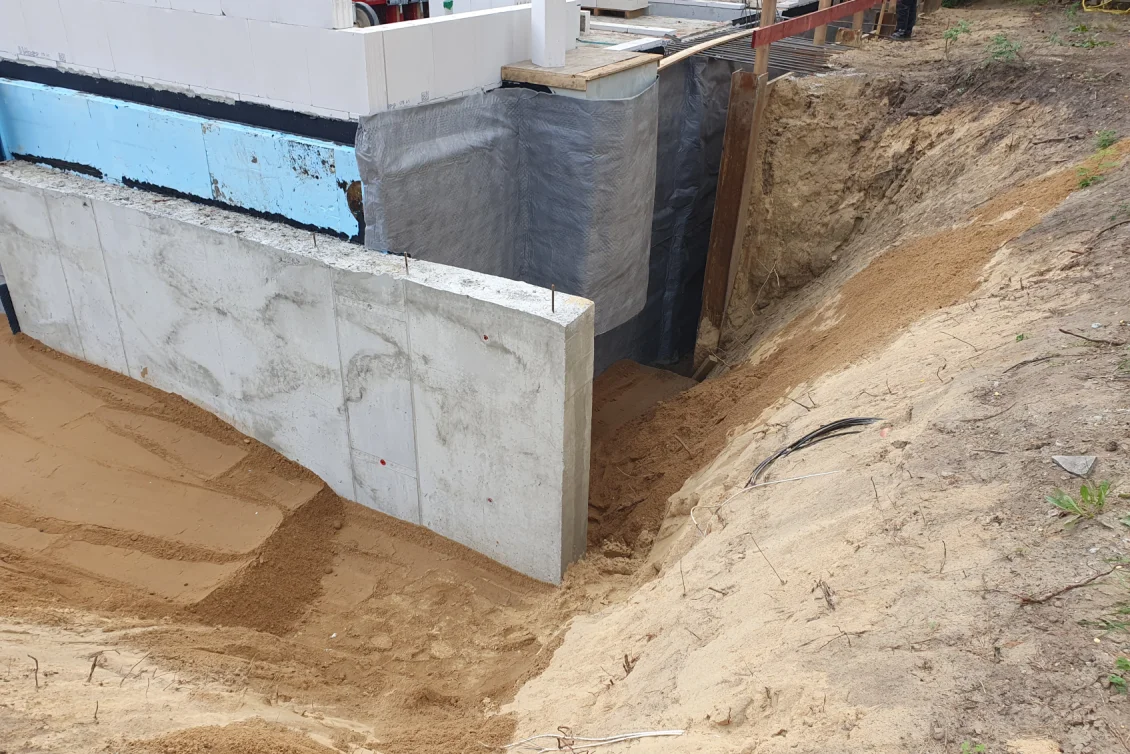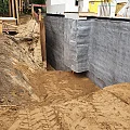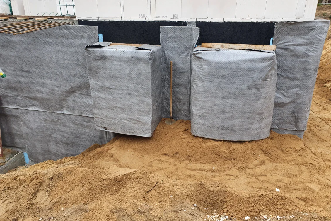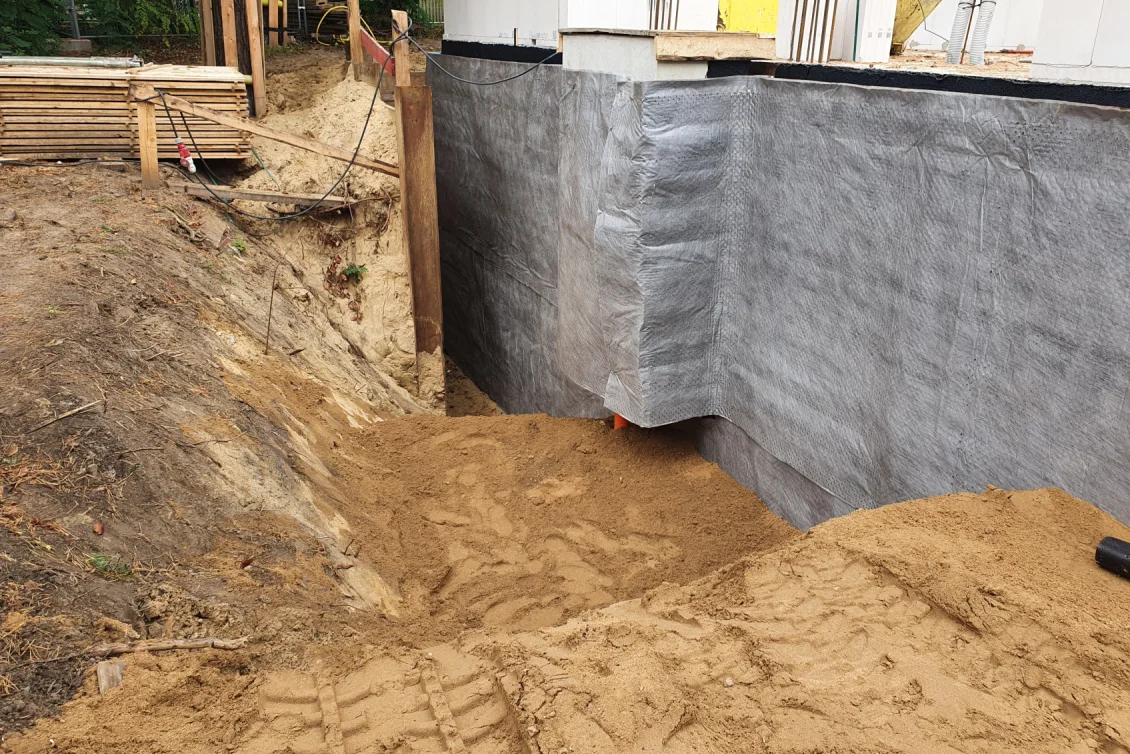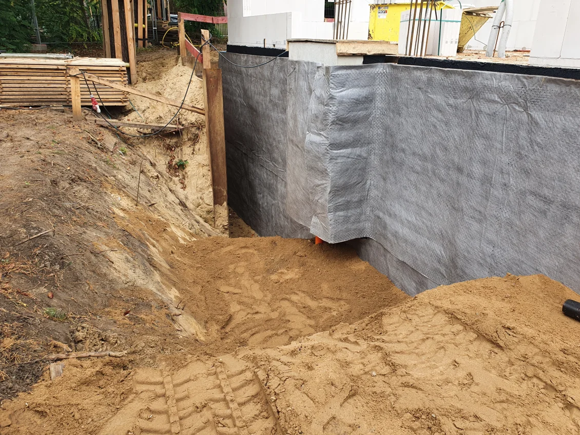 Die letzte Gebäudeseite wird lagenweise verfüllt. Alle 50 cm wird der Füllboden verdichtet, damit es später nicht zu Setzungen des Erdreichs kommt. Die Lichtschächte werden an Sickerpackungen aus Vlies ummantelten grobkörnigen Kies angeschlossen, so dass anfallendes Niederschlagswasser auch bei Starkregenereignissen schnell ablaufen kann.
