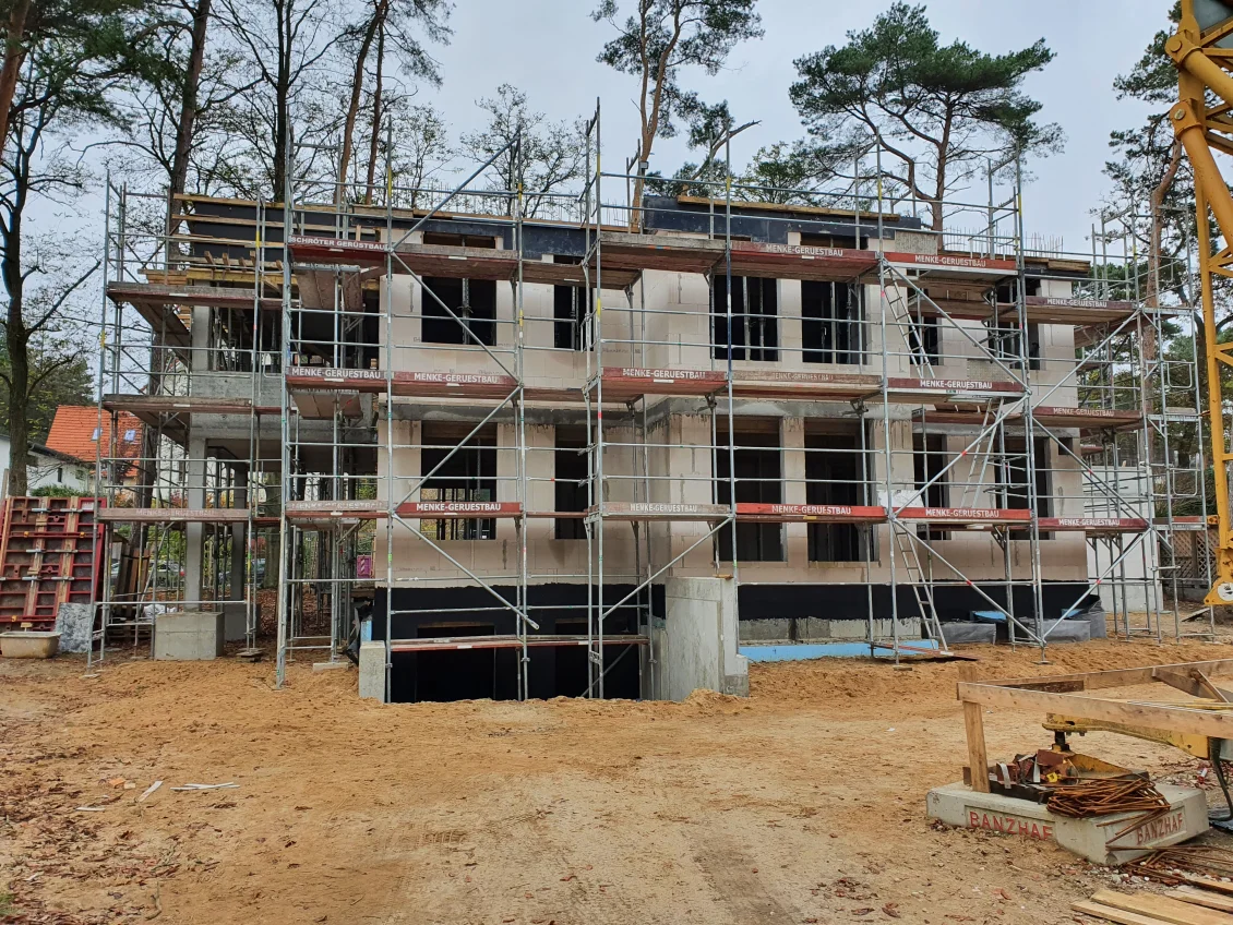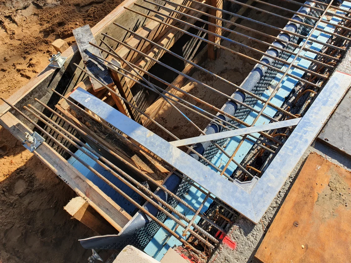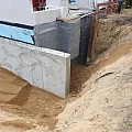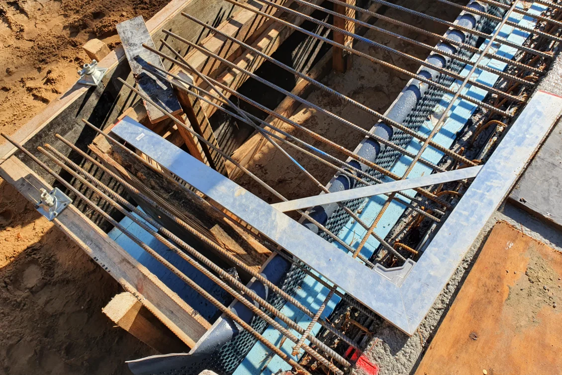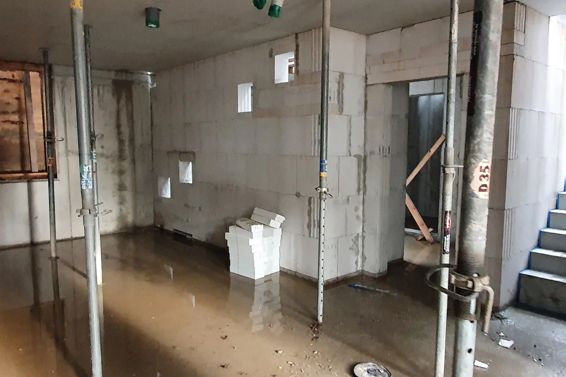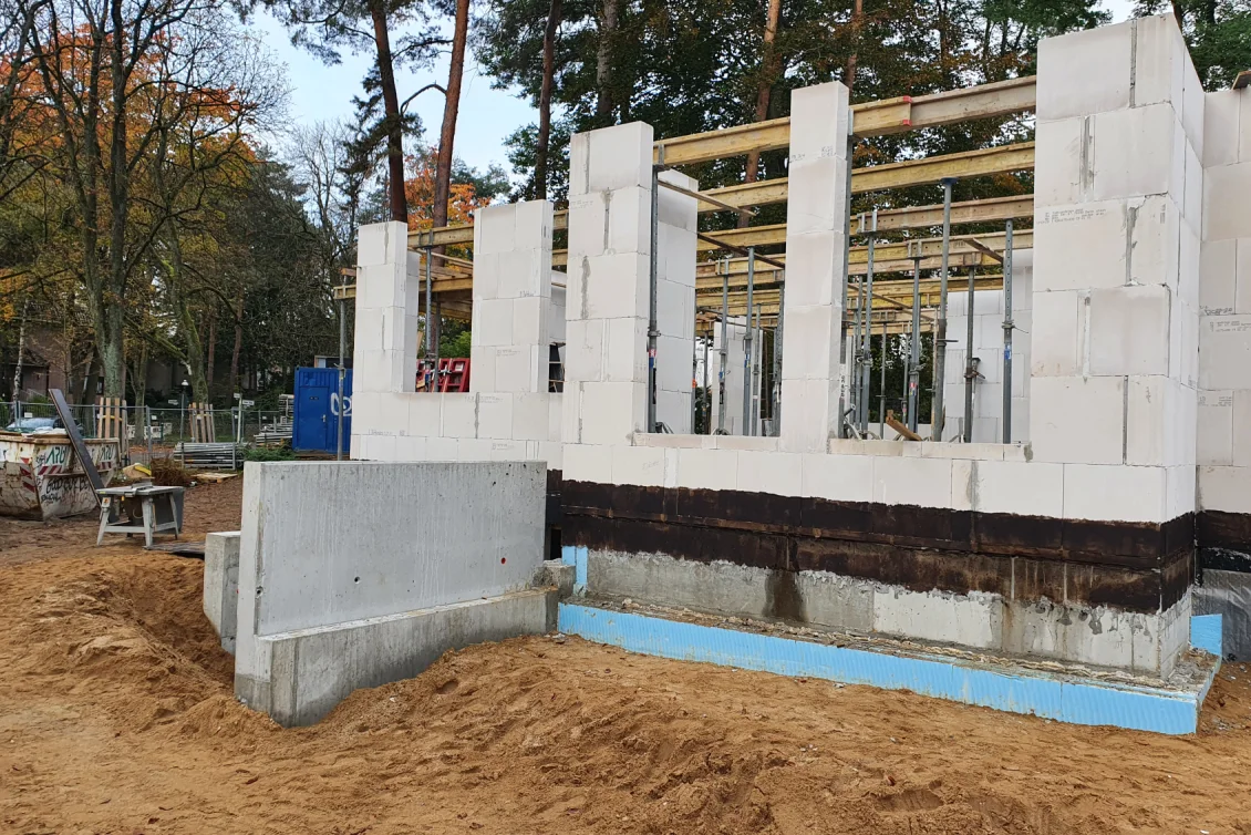 Die letzte Gebäudeseite wird lagenweise verfüllt. Alle 50 cm wird der Füllboden verdichtet, damit es später nicht zu Setzungen des Erdreichs kommt. Die Lichtschächte werden an Sickerpackungen aus Vlies ummantelten grobkörnigen Kies angeschlossen, so dass anfallendes Niederschlagswasser auch bei Starkregenereignissen schnell ablaufen kann.