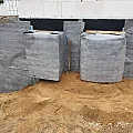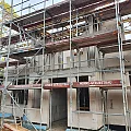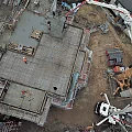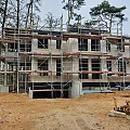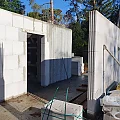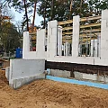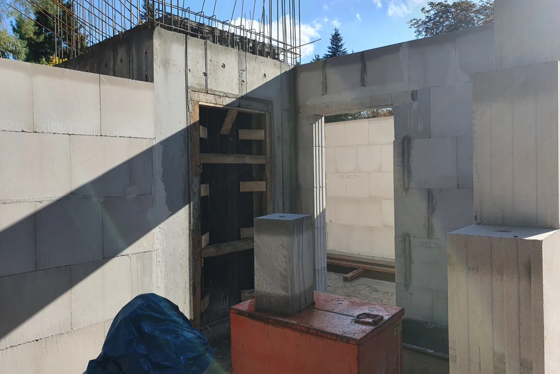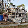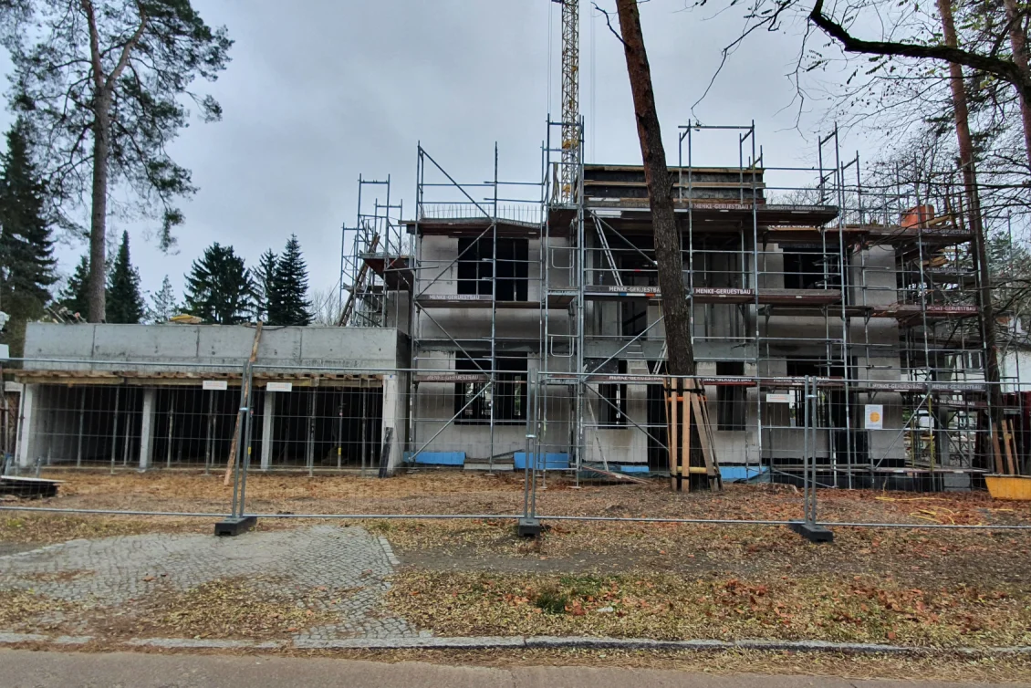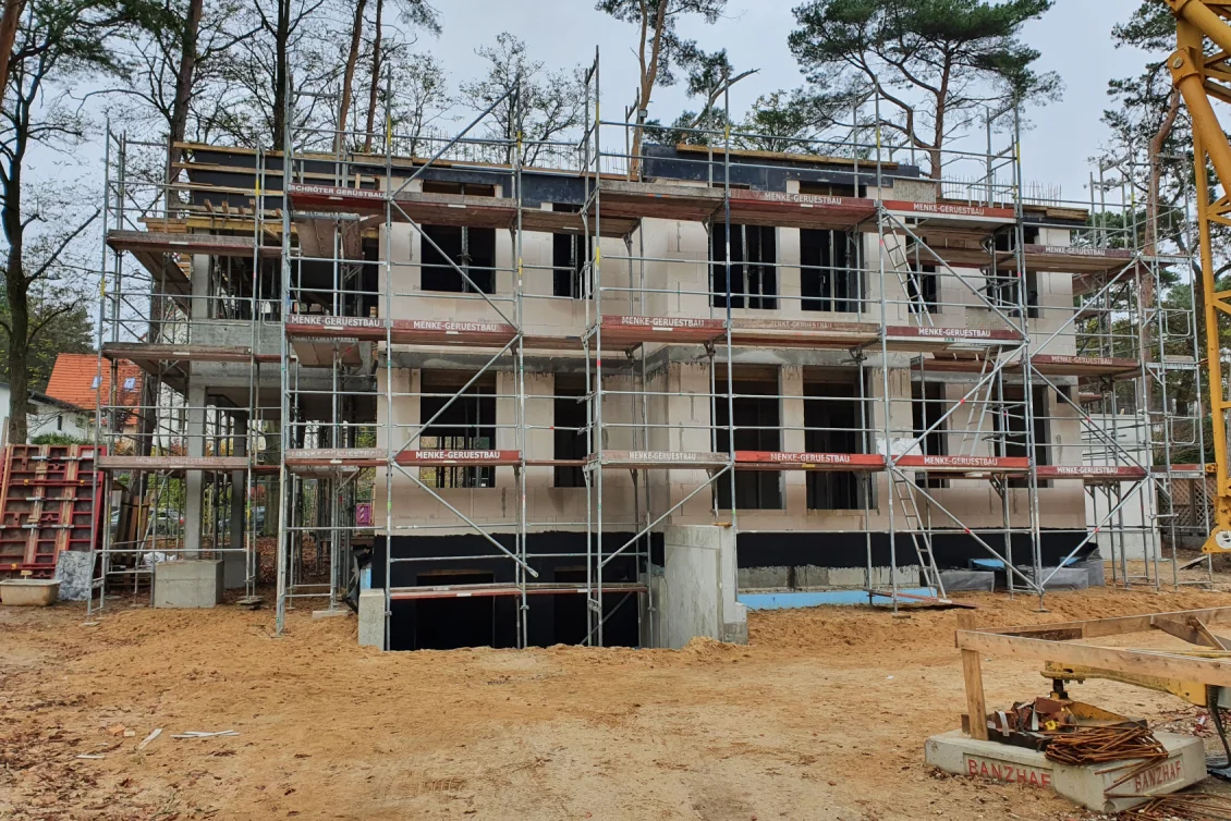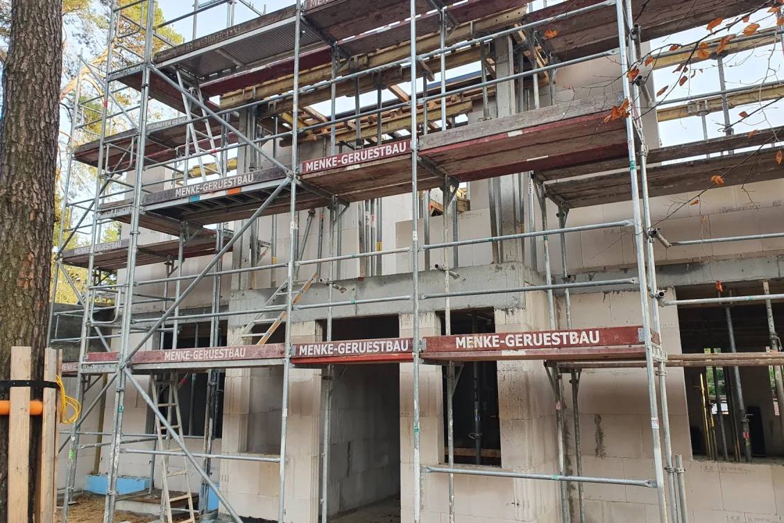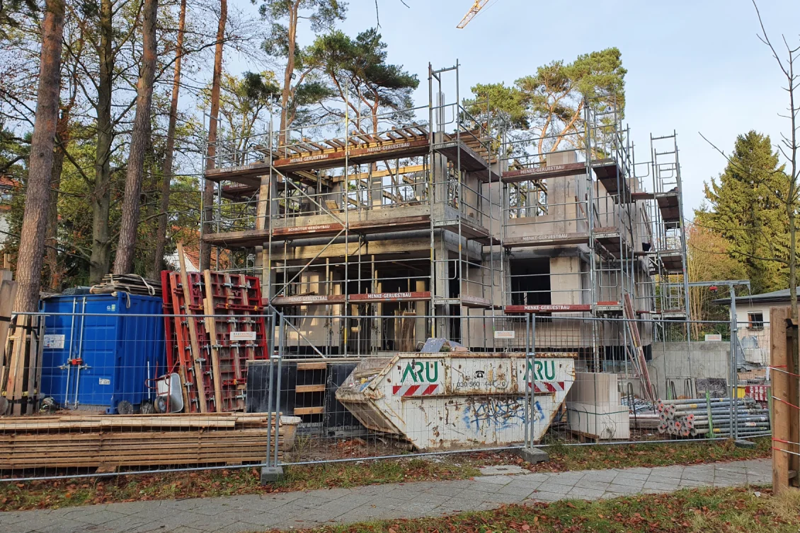 Die letzte Gebäudeseite wird lagenweise verfüllt. Alle 50 cm wird der Füllboden verdichtet, damit es später nicht zu Setzungen des Erdreichs kommt. Die Lichtschächte werden an Sickerpackungen aus Vlies ummantelten grobkörnigen Kies angeschlossen, so dass anfallendes Niederschlagswasser auch bei Starkregenereignissen schnell ablaufen kann.