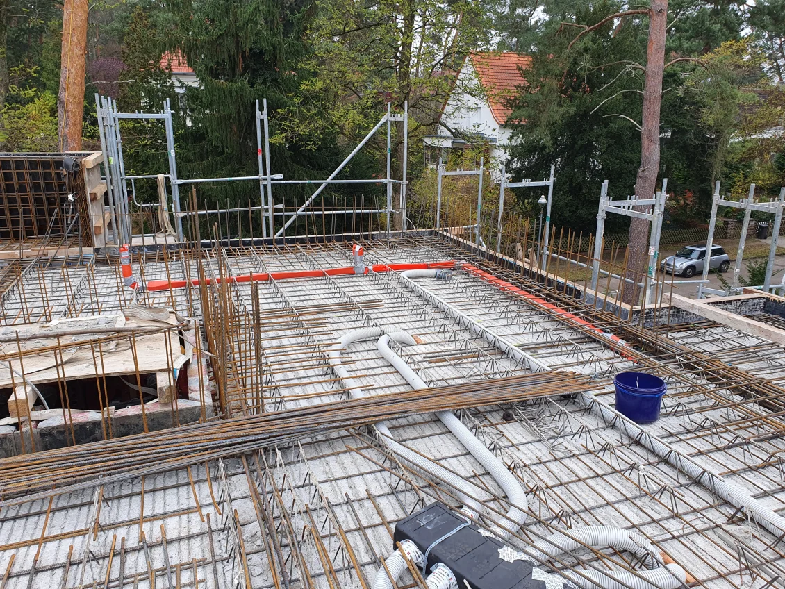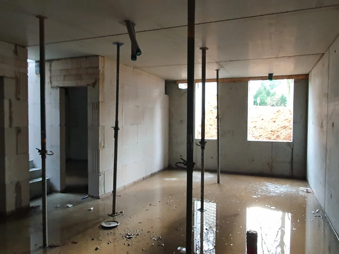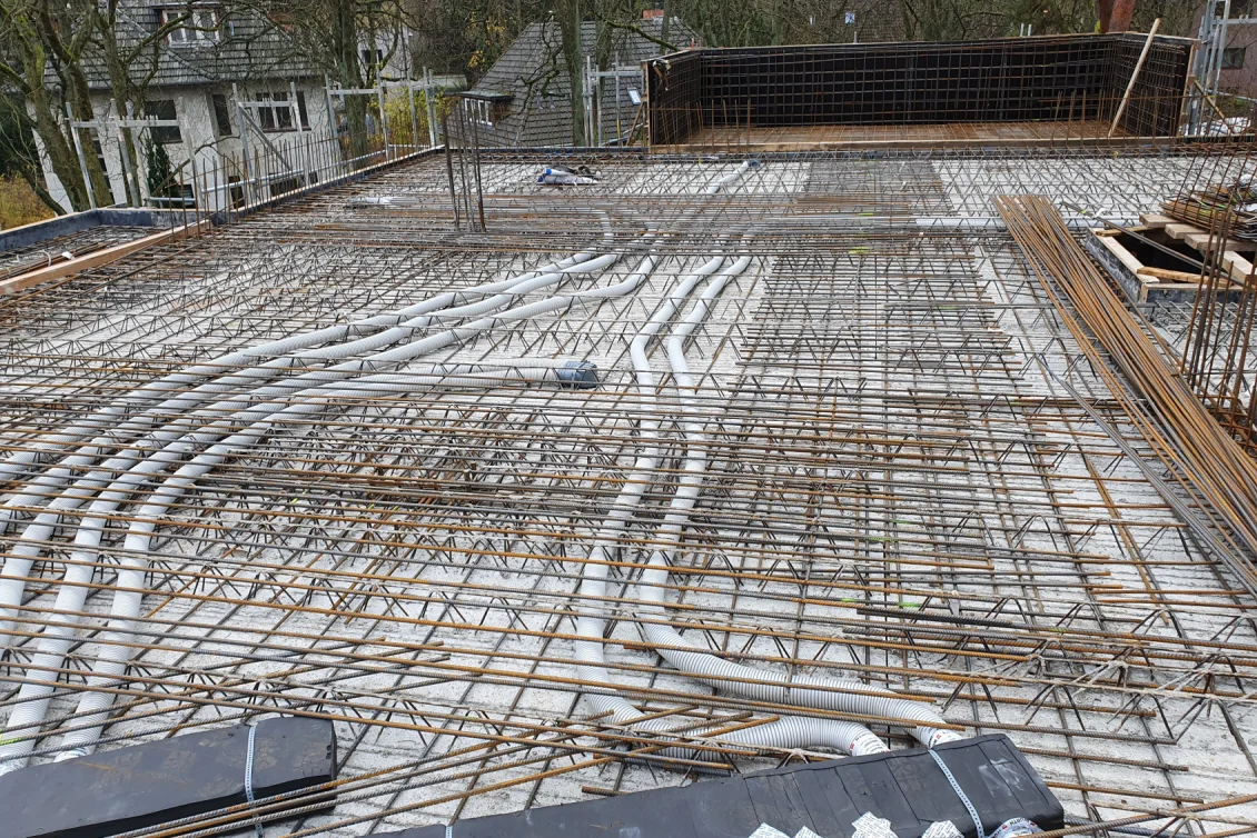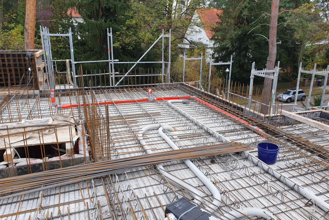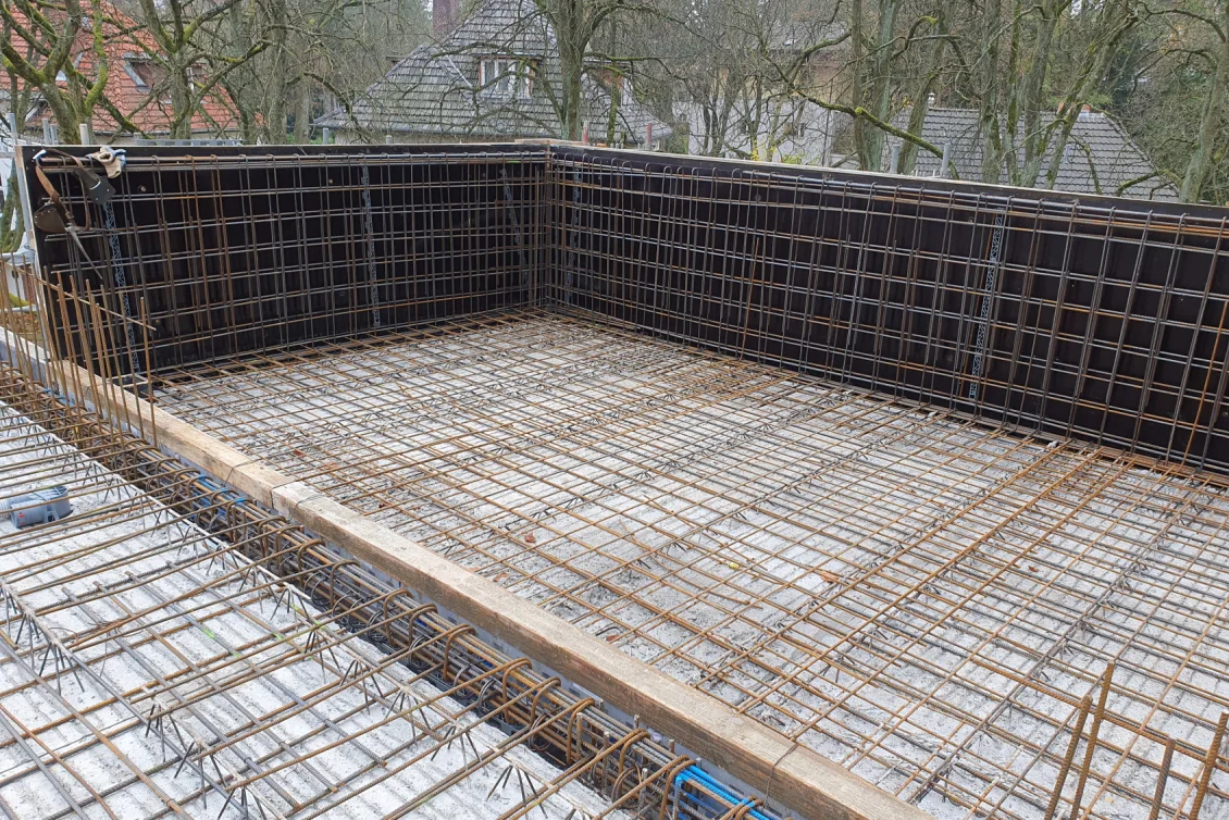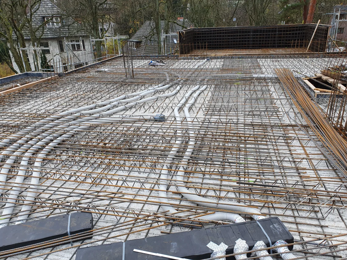 Das Untergeschoss ist jetzt über die Maisonette-Treppe der Gartengeschoss-Wohnung erreichbar. Da die Kellerwände mit den als Halbfertigteile hergestellten “Filigrandecken” abgeschlossen werden, lassen sich die ersten Raumproportionen erkennen und wie viel Tageslicht durch die großen Fensteröffnungen in die Räume fällt.