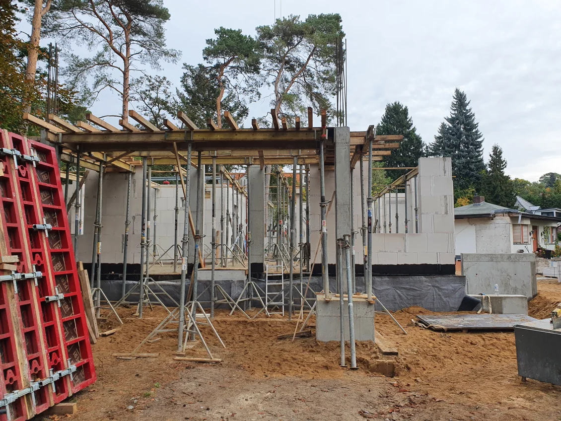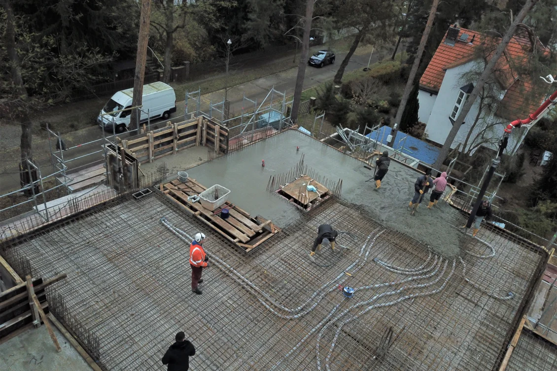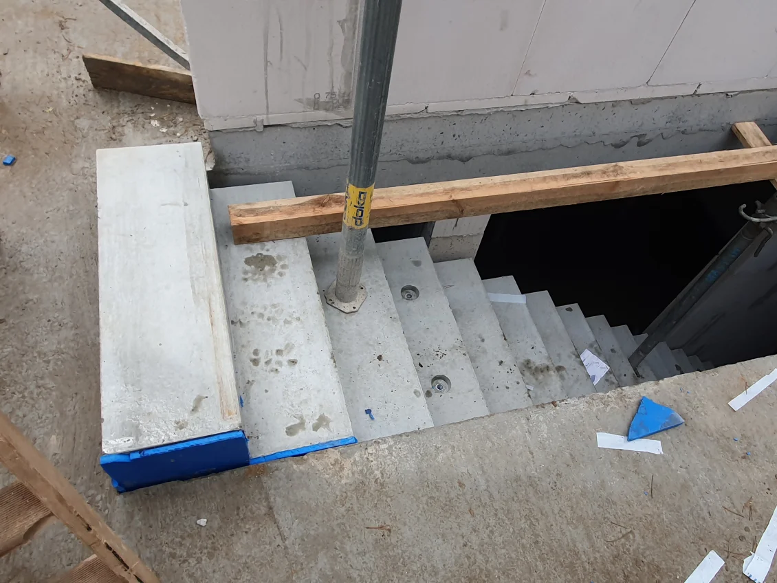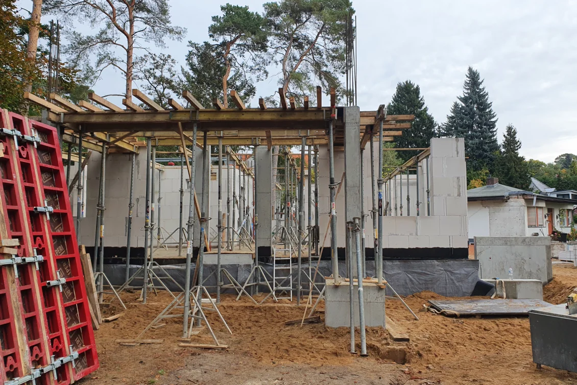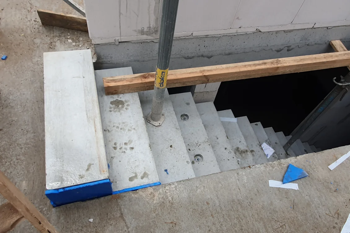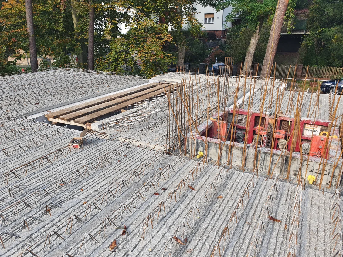 Das Untergeschoss ist jetzt über die Maisonette-Treppe der Gartengeschoss-Wohnung erreichbar. Da die Kellerwände mit den als Halbfertigteile hergestellten “Filigrandecken” abgeschlossen werden, lassen sich die ersten Raumproportionen erkennen und wie viel Tageslicht durch die großen Fensteröffnungen in die Räume fällt.