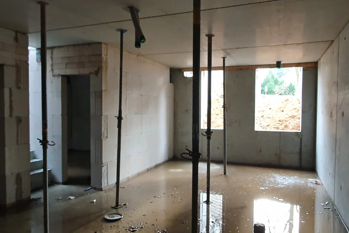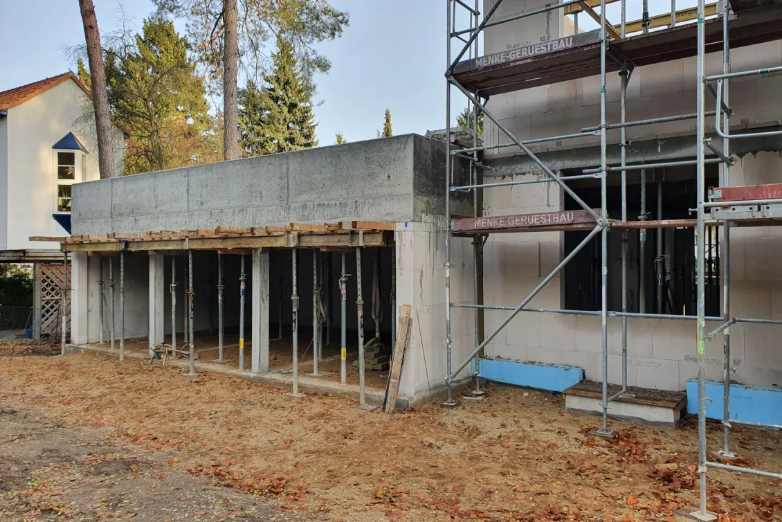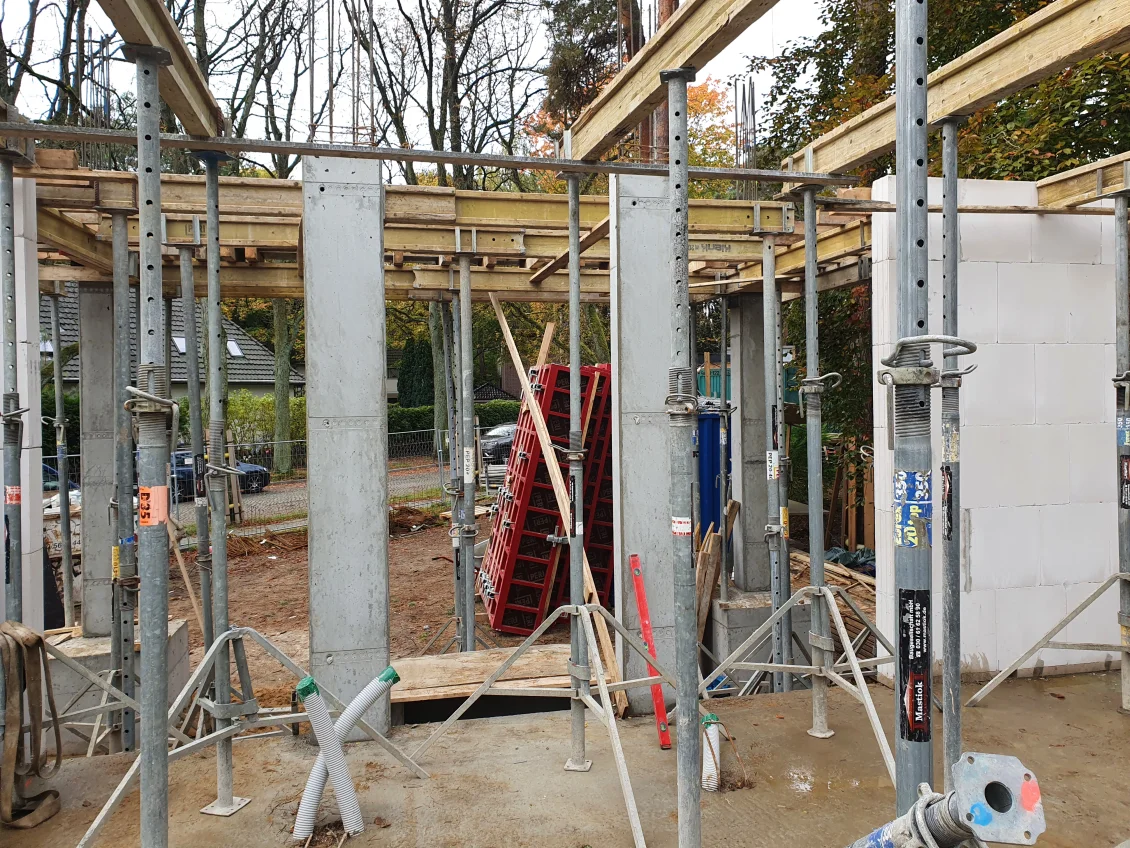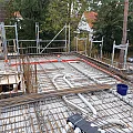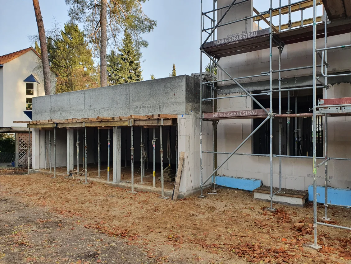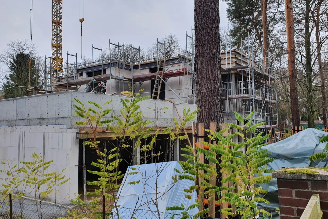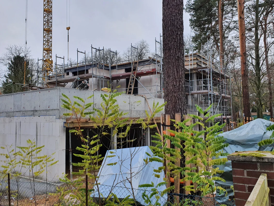 Das Untergeschoss ist jetzt über die Maisonette-Treppe der Gartengeschoss-Wohnung erreichbar. Da die Kellerwände mit den als Halbfertigteile hergestellten “Filigrandecken” abgeschlossen werden, lassen sich die ersten Raumproportionen erkennen und wie viel Tageslicht durch die großen Fensteröffnungen in die Räume fällt.