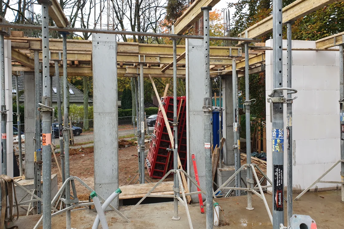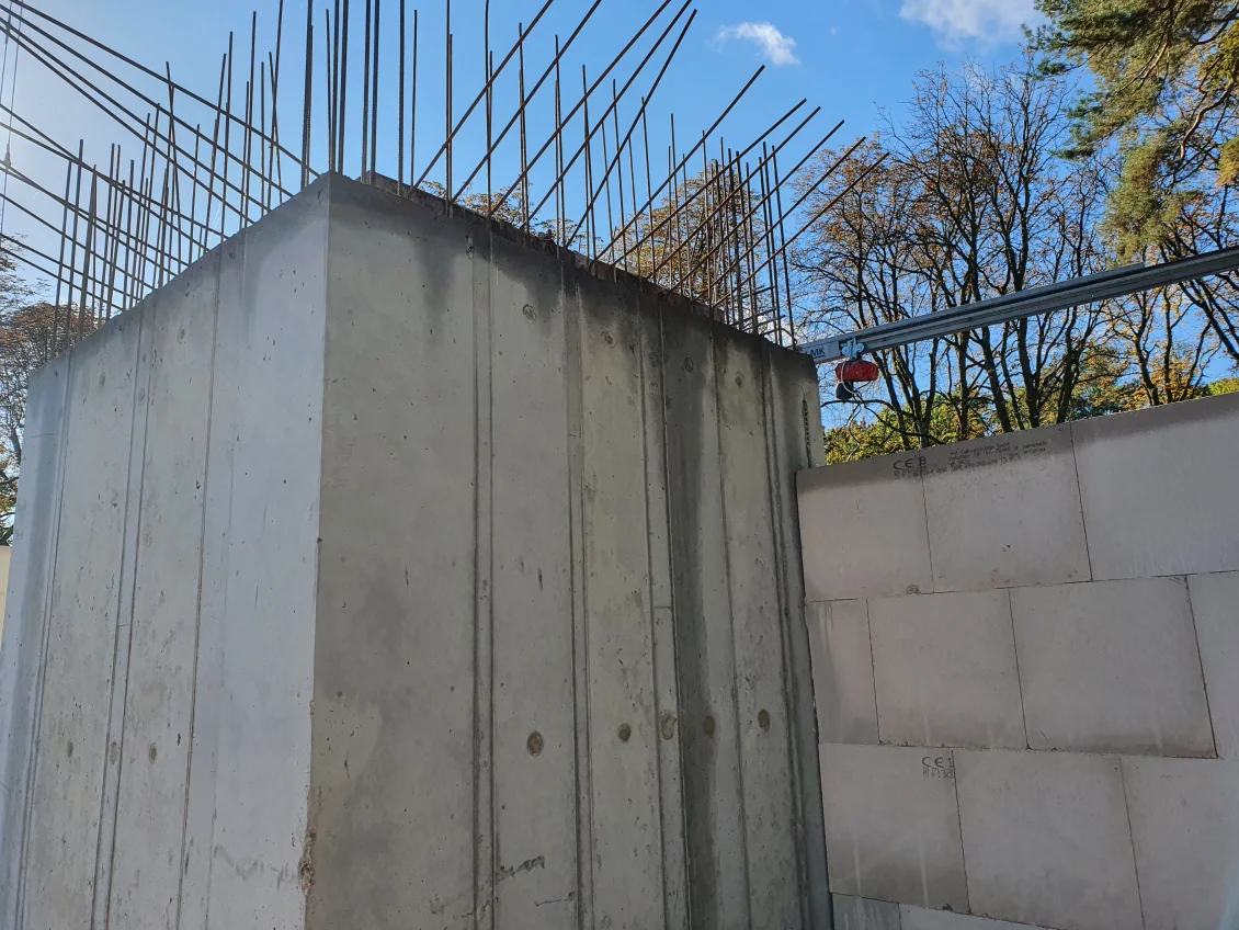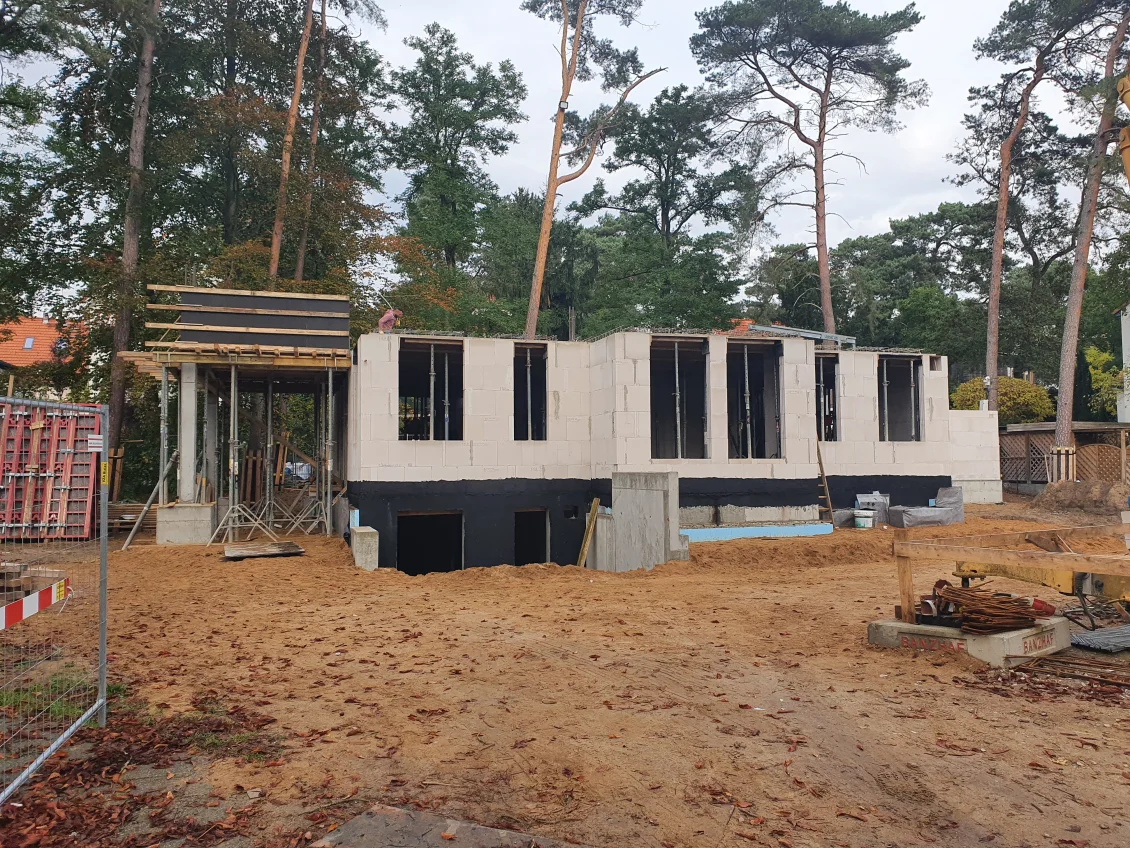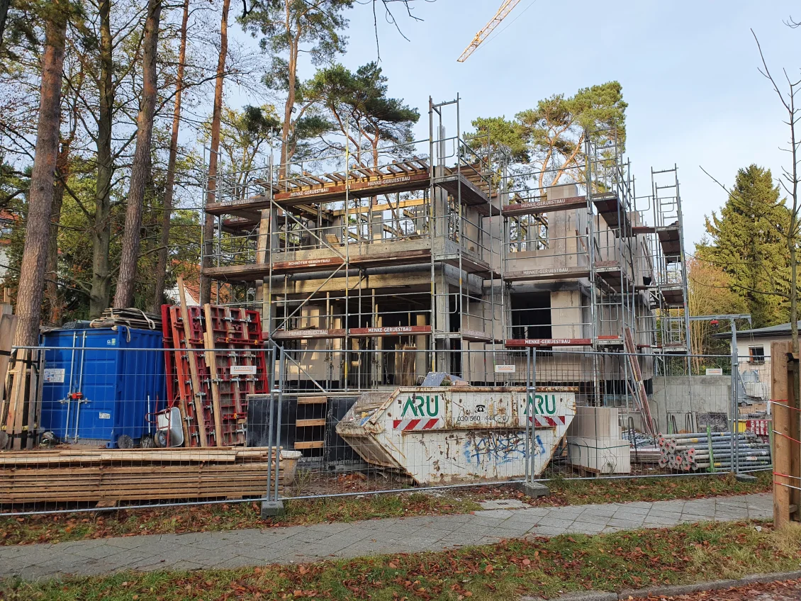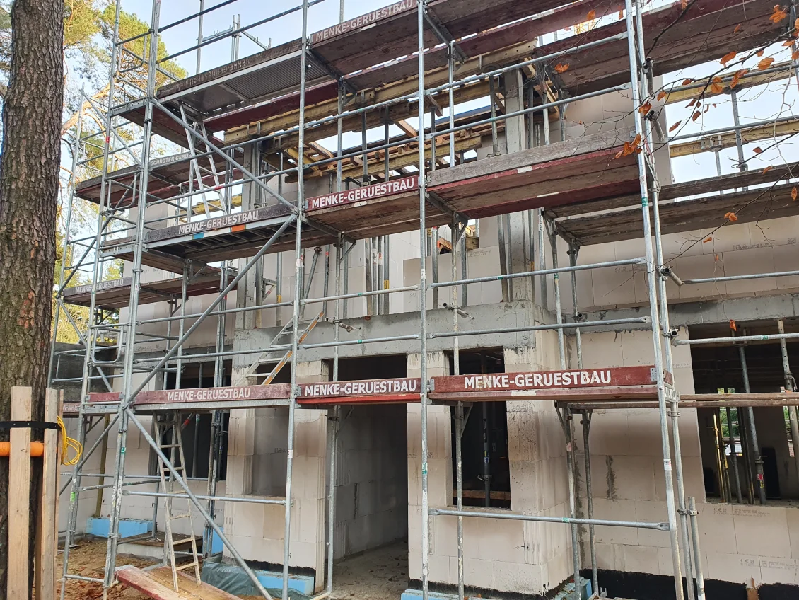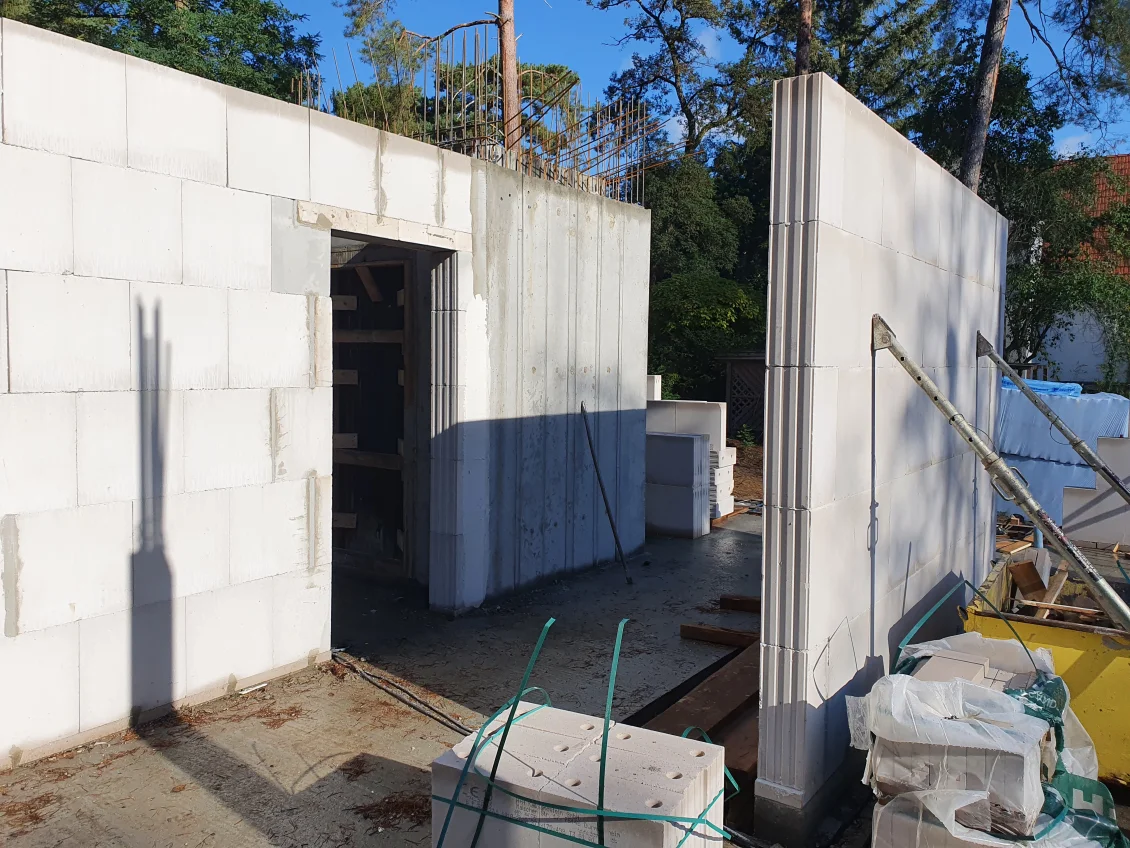 Das Untergeschoss ist jetzt über die Maisonette-Treppe der Gartengeschoss-Wohnung erreichbar. Da die Kellerwände mit den als Halbfertigteile hergestellten “Filigrandecken” abgeschlossen werden, lassen sich die ersten Raumproportionen erkennen und wie viel Tageslicht durch die großen Fensteröffnungen in die Räume fällt.