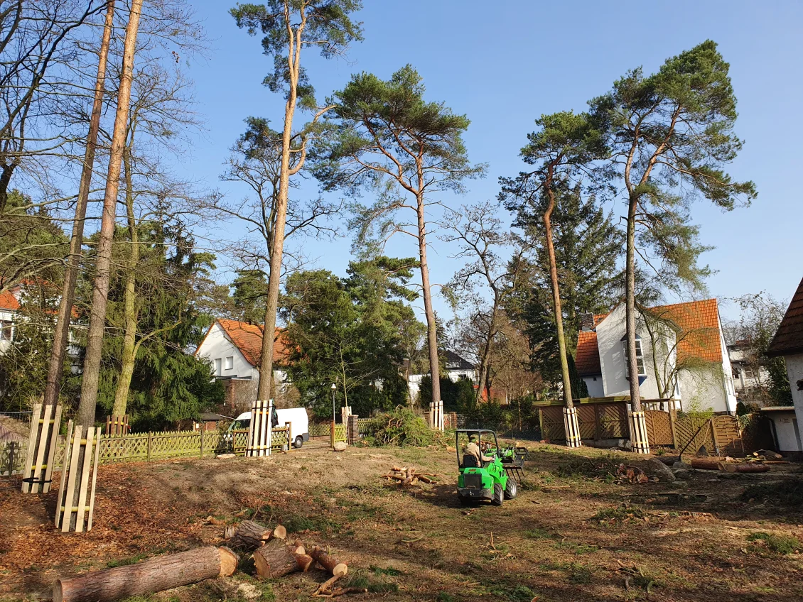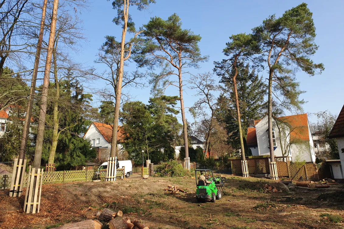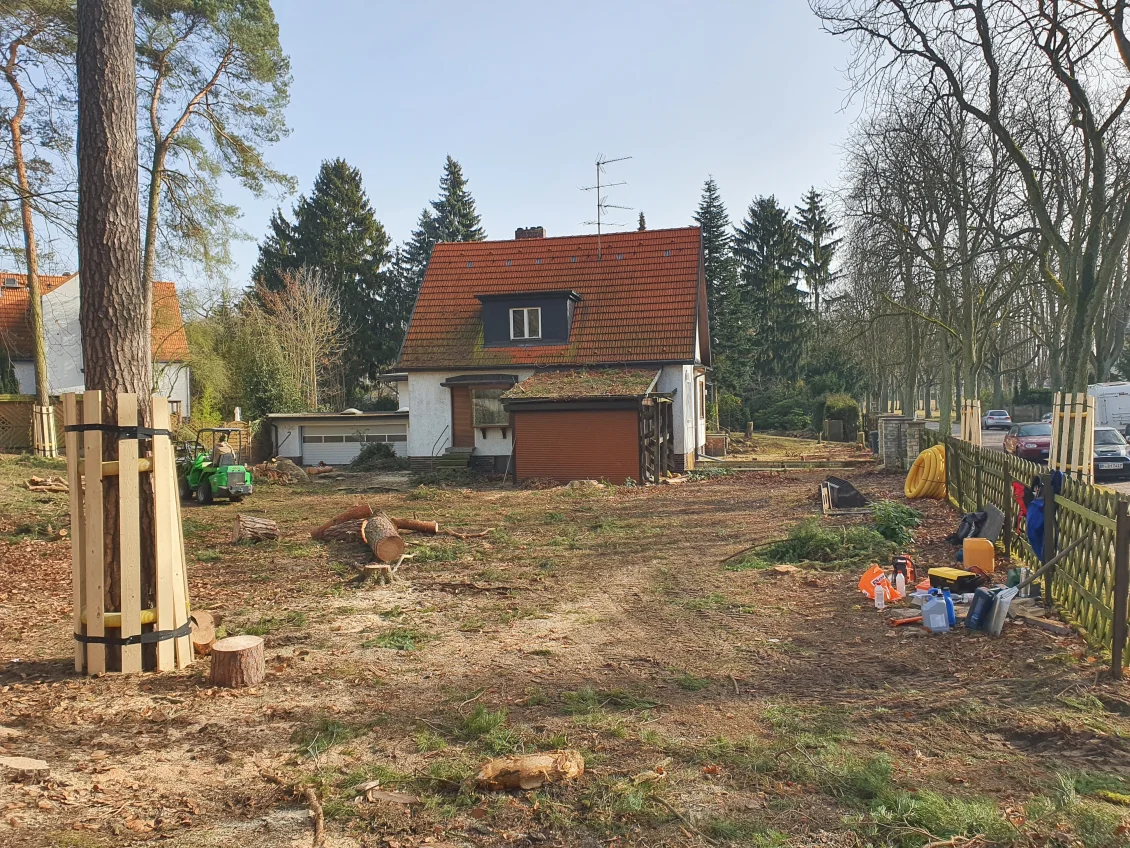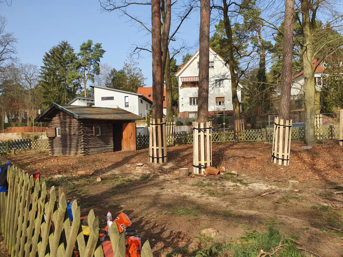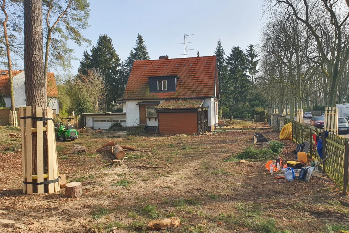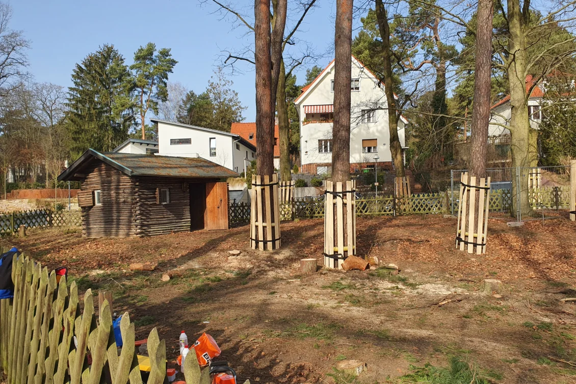 Die zur Fällung genehmigten Bäume sind bereits entnommen worden. Auf dem Grundstück verbleibende Bäume erhalten einen “Bretterkragen” als Schutz vor Beschädigungen während der Bauzeit. Der Bereich um die Buche wird weiträumig mit einem eigenen Zaun gesperrt.