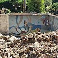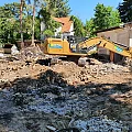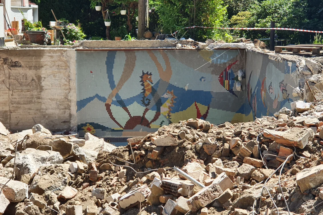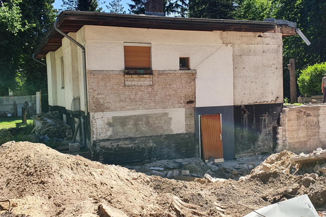 Endlich dürfen wir mit dem Abbruch des Bestandgebäudes beginnen. Unter dem Zwischenbau zum Nachbargrundstück wird ein Schwimmbecken mit umfangreicher Technik demontiert.