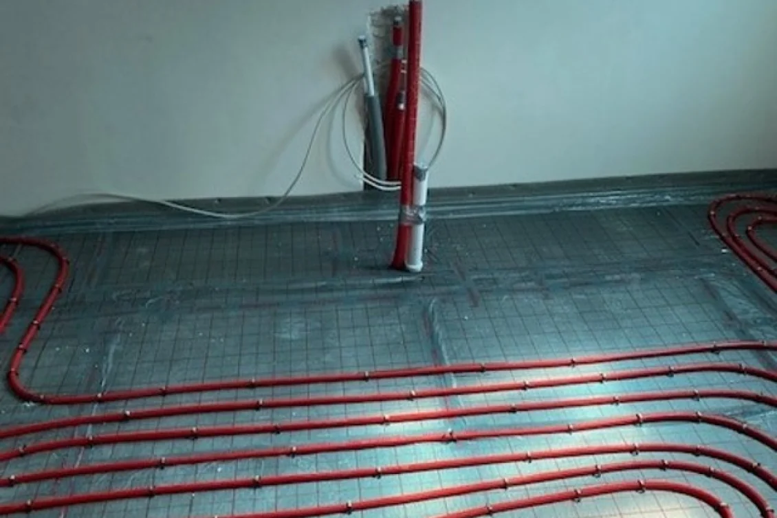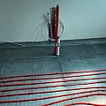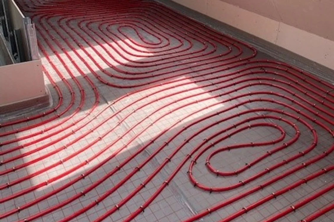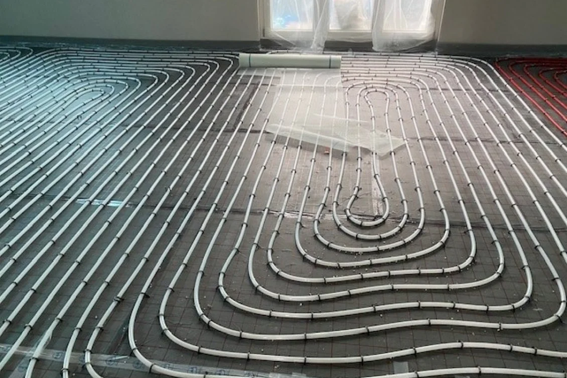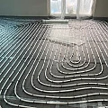 Die Rohrschleifen der Fußbodenheizung werden auf der Trittschalldämmung verlegt. Deutlich lässt sich der sehr enge Verlegeabstand erkennen, der aus der energiesparenden, niedrigen Vorlauftremperatur der Erdwärmepumpe resultiert.