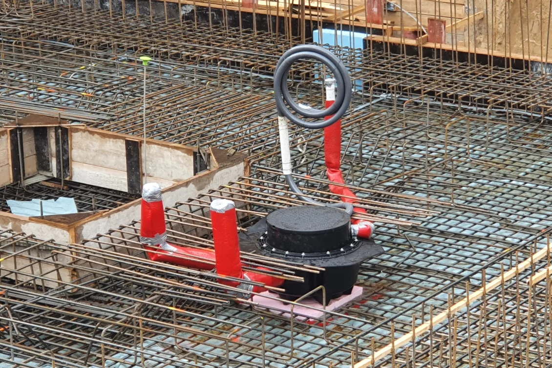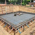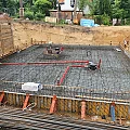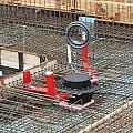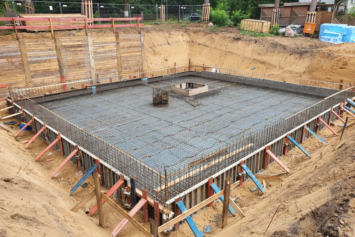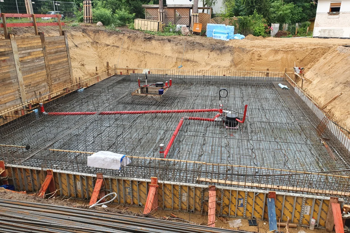 Die Stabstahl-Bewehrung der Bodenplatte wird aufgelegt. Außerdem werden die Hebeanlagen und Grundleitungen positioniert, welche später in der Bodenplatte einbetoniert werden.