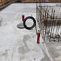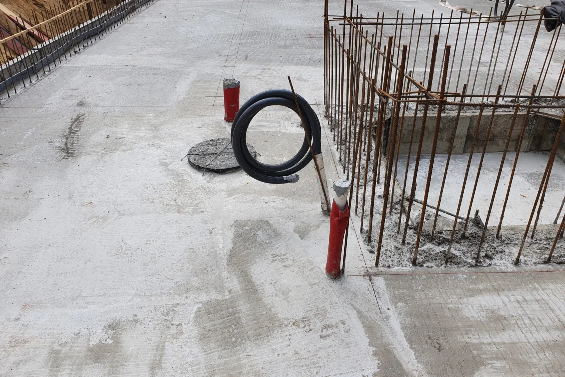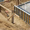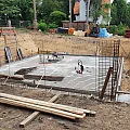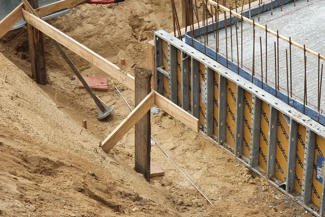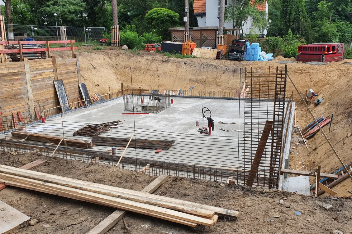 Aus der fertig betonierten Bodenplatte ragen die Anfängereisen der Betonkellerwände, deren genaue Lage der Vermesser auf den seitlich aufgestellten Holz-Schnurböcken markiert. Die Vertiefung in der Mitte der Platte zeigt die Aufzugsunterfahrt.