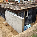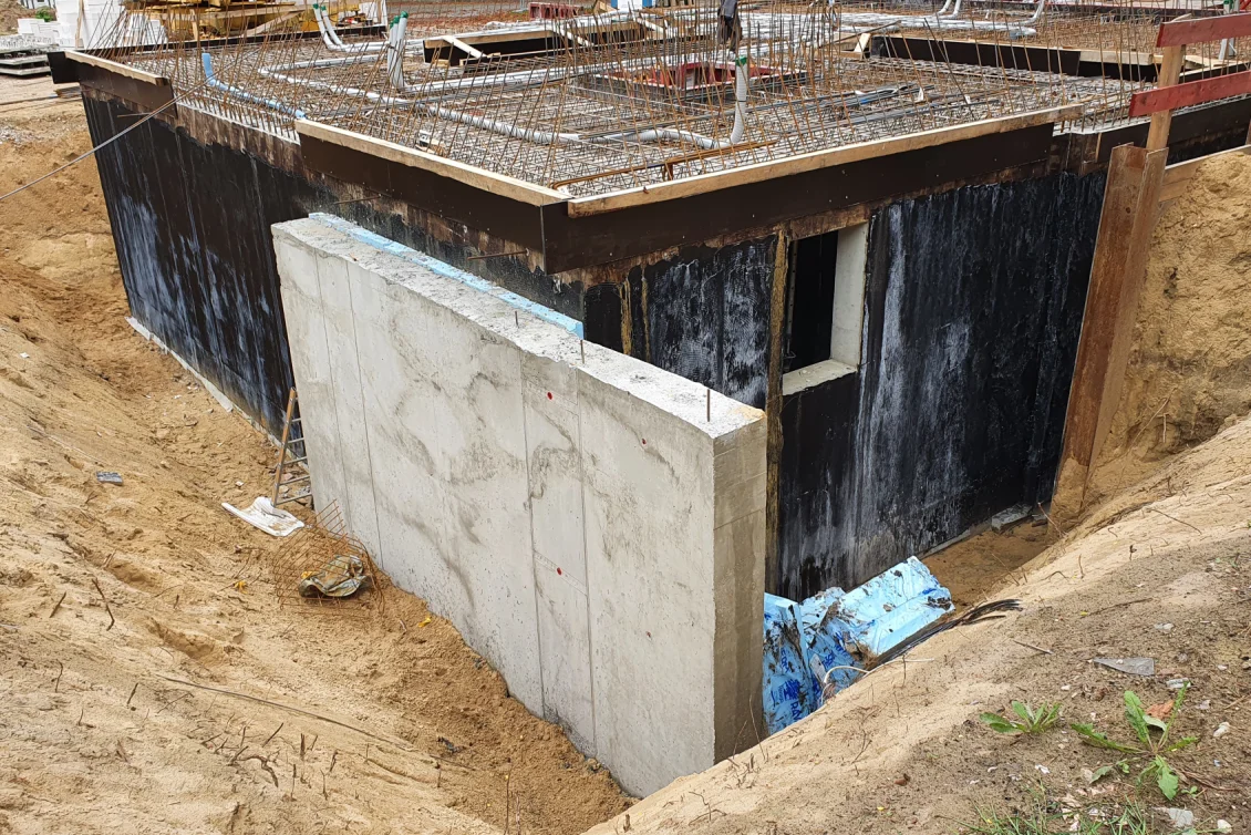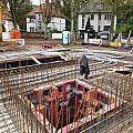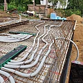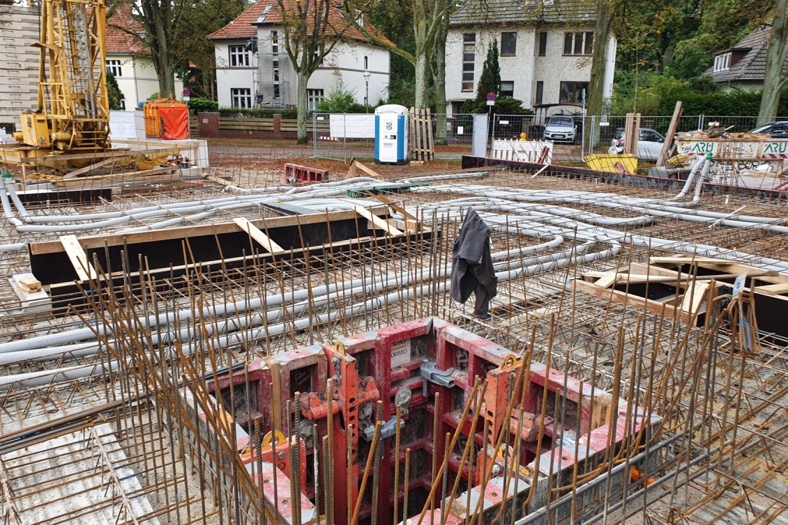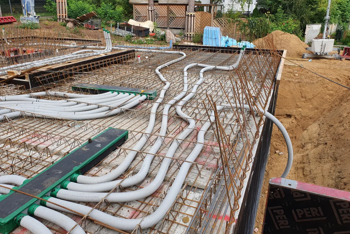 In der Kellerdecke werden die Leitungen für die kontrollierte Wohnraumlüftung verlegt und später einbetoniert. So müssen die Wohnräume nicht mit Zwischendecken abgehängt werden und es geht keine wertvolle Raumhöhe verloren. Außen werden die Stützwände der künftigen Abböschungen erstellt.