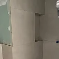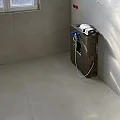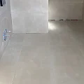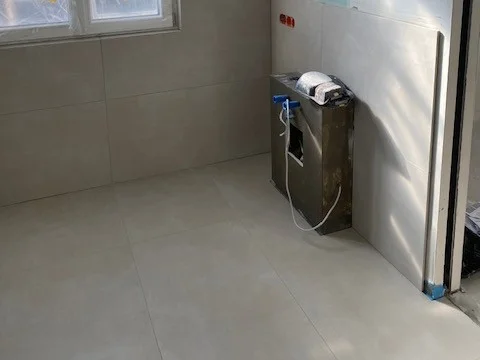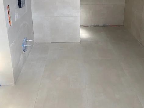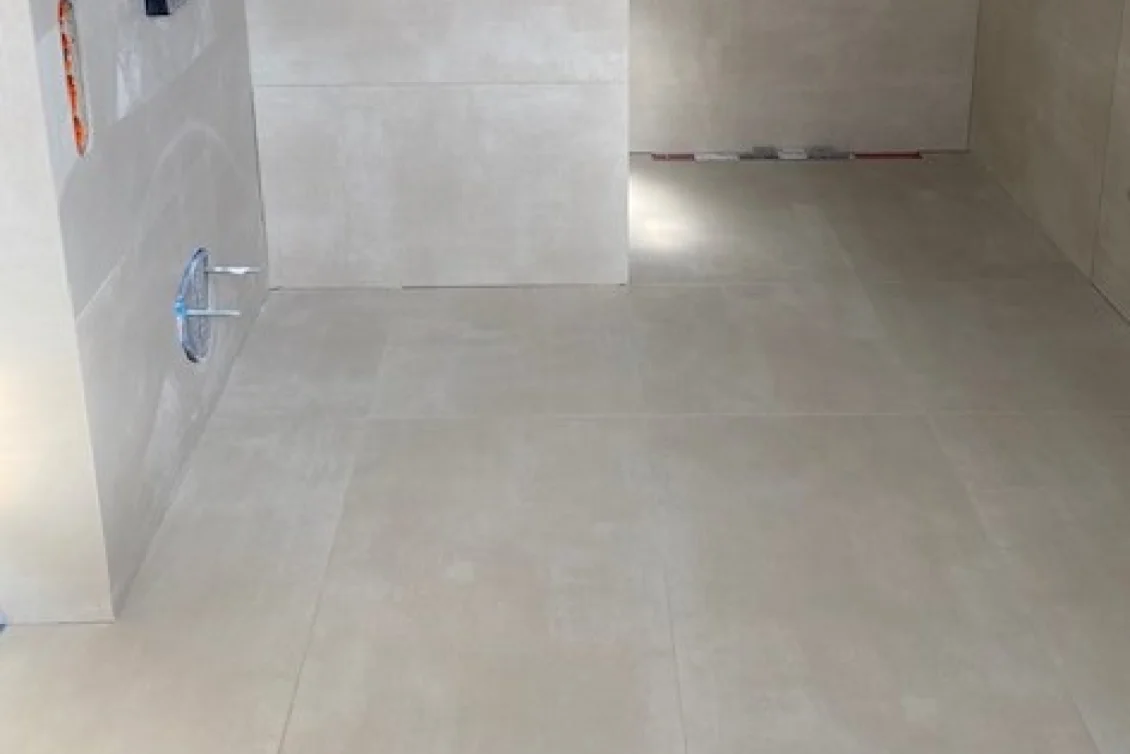 Die großformatigen Fliesen in den Bäder verlangen besonders ebene Untergründe. Jetzt zahlt sich die Sorgfalt der Vorarbeiten aus.