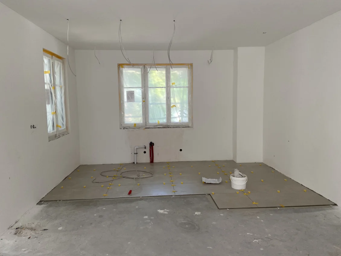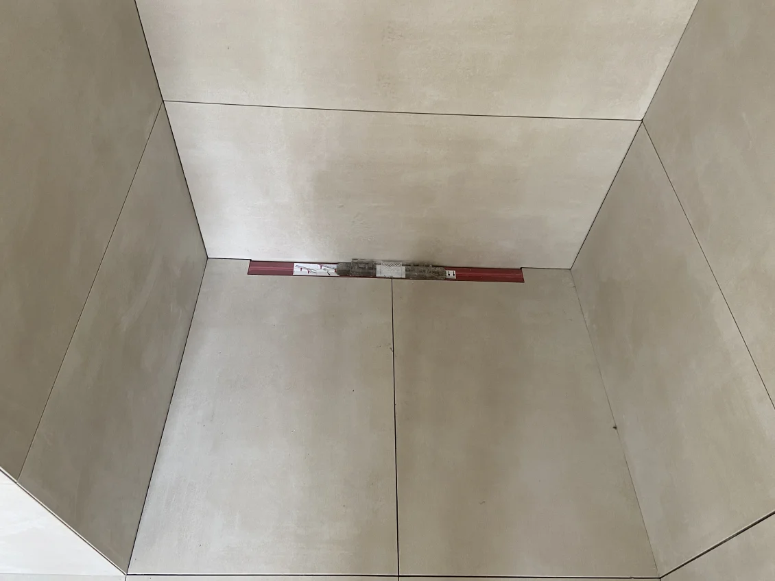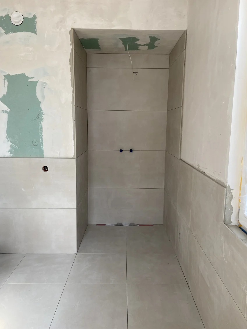 Die Fliesenarbeiten werden gemäß der Detailplanung der Bäder ausgeführt. Die horizontalen und vertikalem Fliesenfugen wurden hierbei von der Planung auf die späteren Badobjekte und Armaturen ausgerichtet. Die Ecken werden vom Fliesenleger auf Gehrung geschnitten und verklebt, um ein gleichmäßiges Endergebnis zu erhalten. Nach dem Verlegen der Fliesen werden die Fugen noch mit einem farblich passenden Fugenmörtel verfugt.