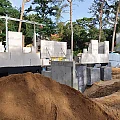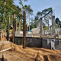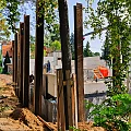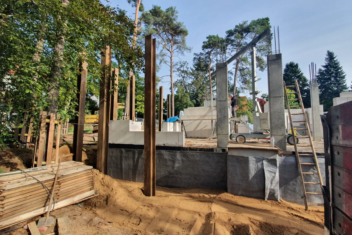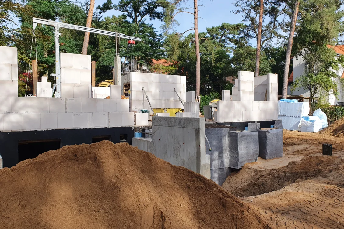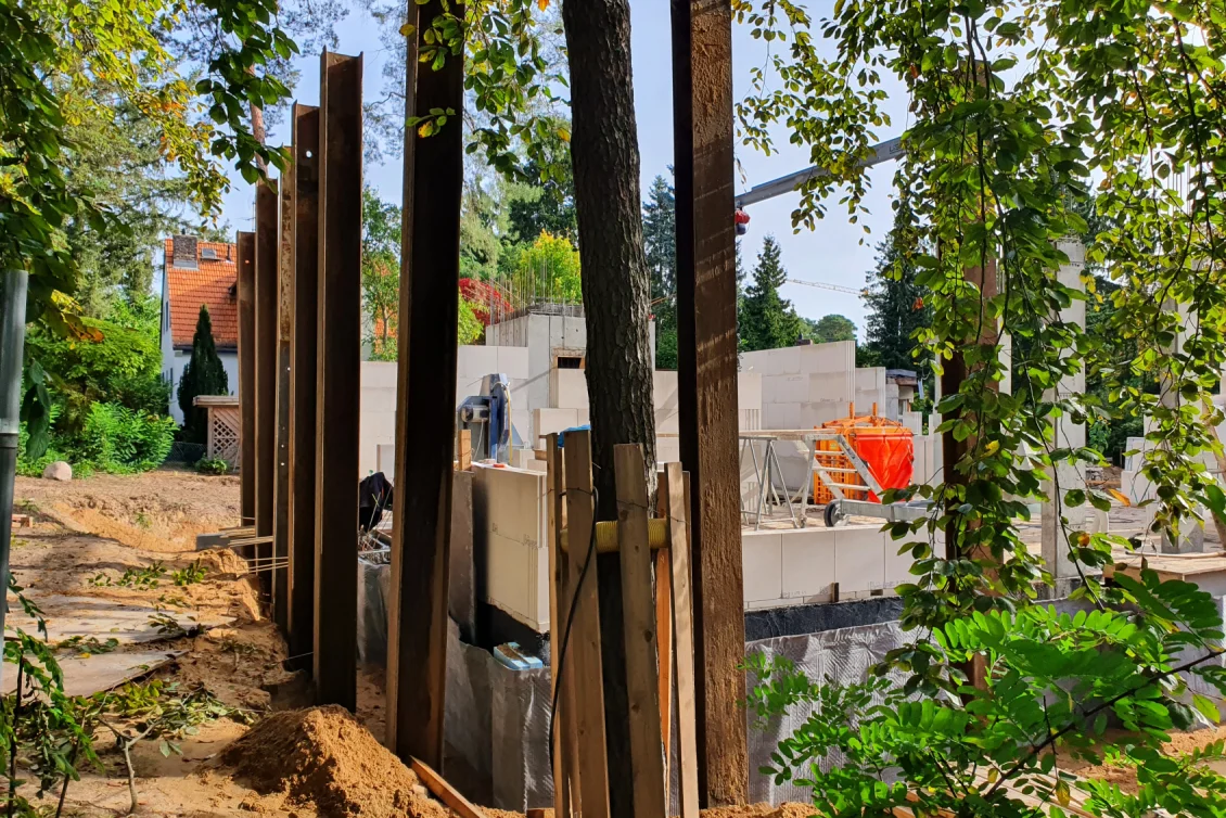 Über 8 m lang sind die Stahlträger des Verbaus, die jetzt wieder mit einer Spezialmaschine aus dem Erdreich gezogen und zum nächsten Einsatzort transportiert werden. Die Wände im Erdgeschoss wachsen weiter, wobei die bis zu 80 kg schweren Steine mit einem Versetzkran auf die richtige Position gebracht werden.